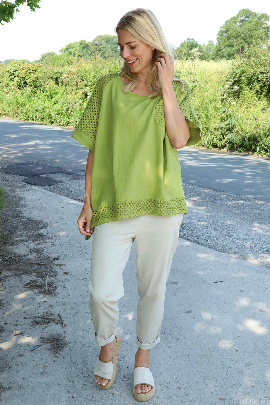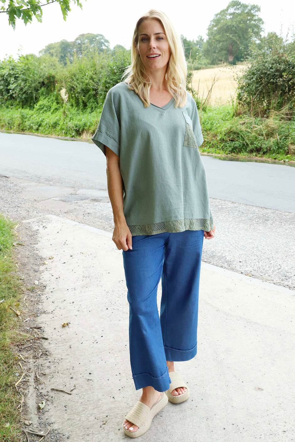 Kristiana Crochet Detail Linen Top Dark Khaki