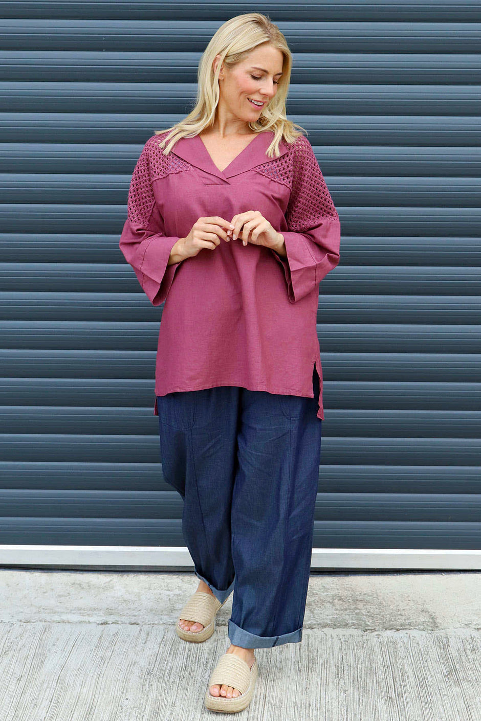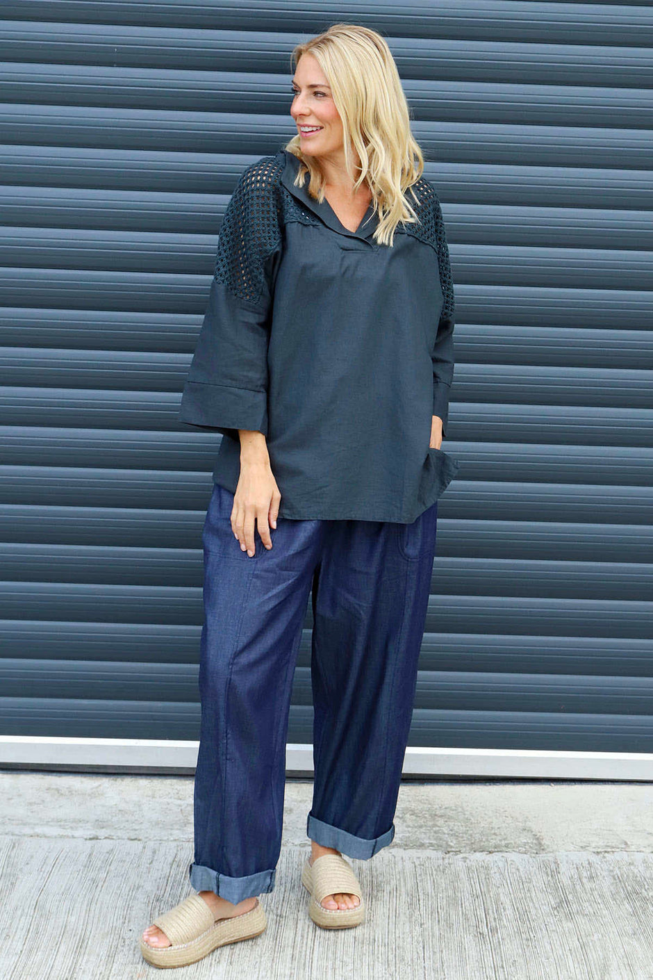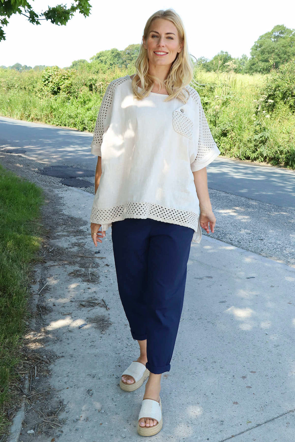 Natasha Crochet Shoulder Linen Top Royal Blue