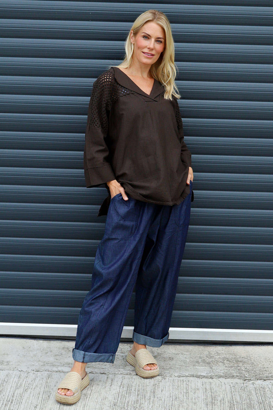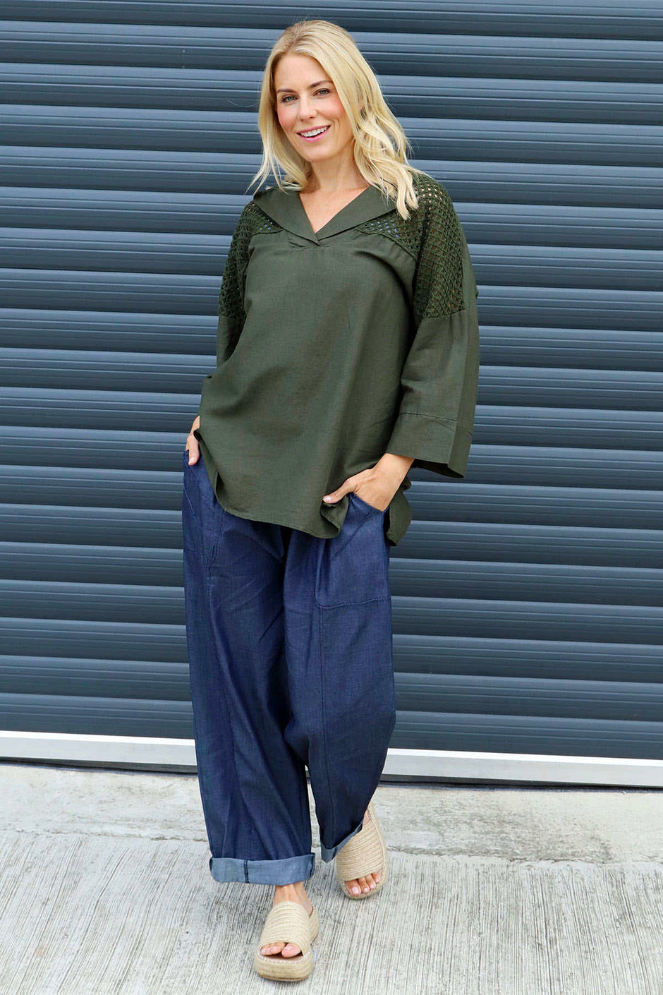 Natasha Crochet Shoulder Linen Top Dark Khaki