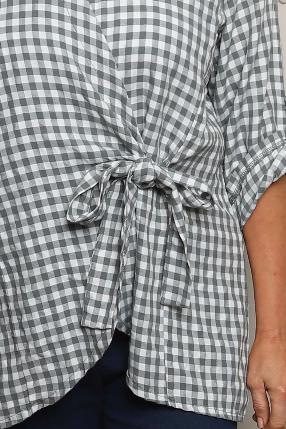 Shyla Gingham Wrap Cotton Top Mid Grey