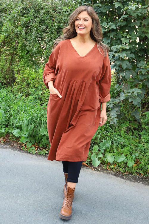 New InAvailable to Pre-OrderMade in Italy Made in ItalyDinah V-Neck Needlecord Dress Burnt Orange