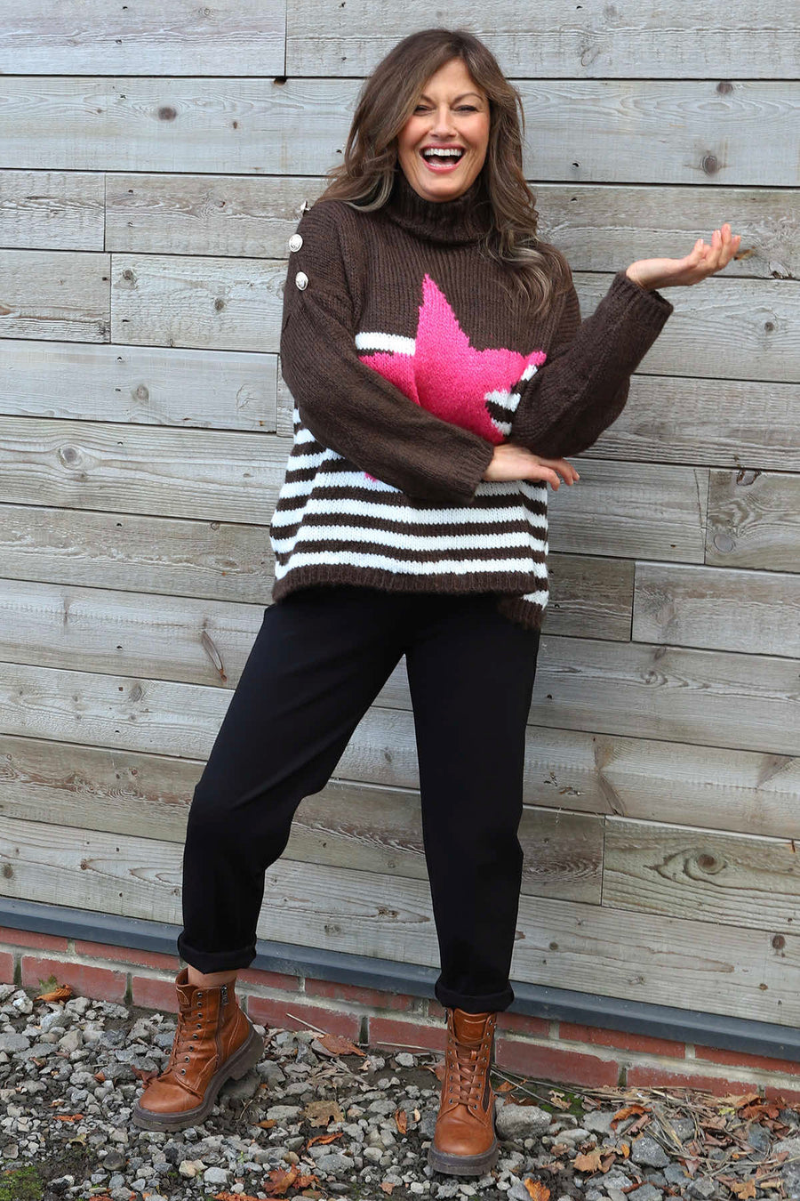 Stay cosy with the Agata Star Knitted Jumper. The Agata Star Knitted Jumper is designed to keep you warm and comfortable with its soft knit and high neck. The horizontal stripes and neon star pattern bring a touch of playful style, while the button shoulder detail adds an easy-to-wear feature. This jumper combines comfort and charm for everyday wear.