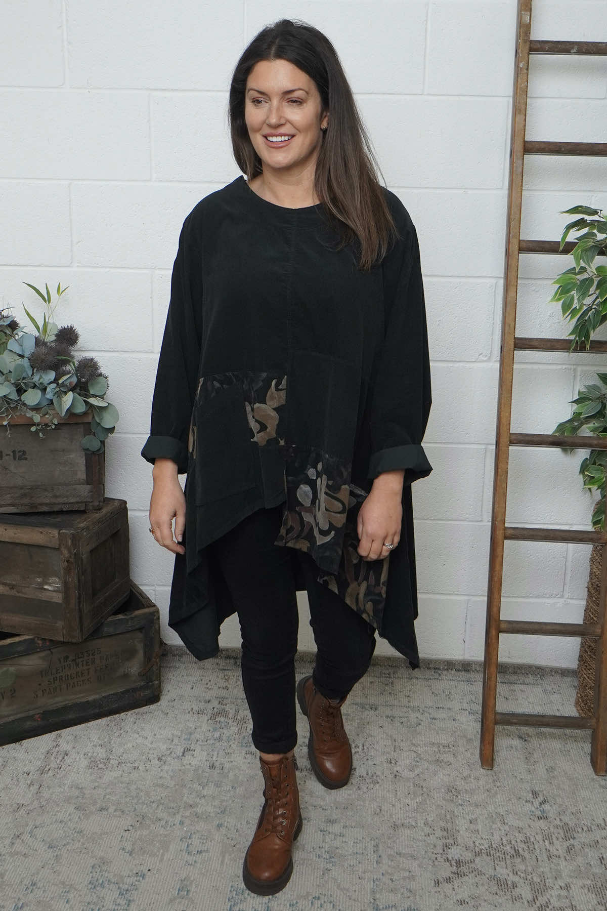 Step out in style with the Berenice Print Detail Needlecord Top, a wardrobe essential that combines comfort with contemporary design. Crafted from quality needlecord fabric, this top feels as good as it looks, offering a soft texture that's built to last. The supportive round neckline flatters all shapes, while distinctive print panel details inject personality into your everyday look. The functional pocket adds practicality without compromising style, and the asymmetric hem delivers a modern twist that catches the eye.