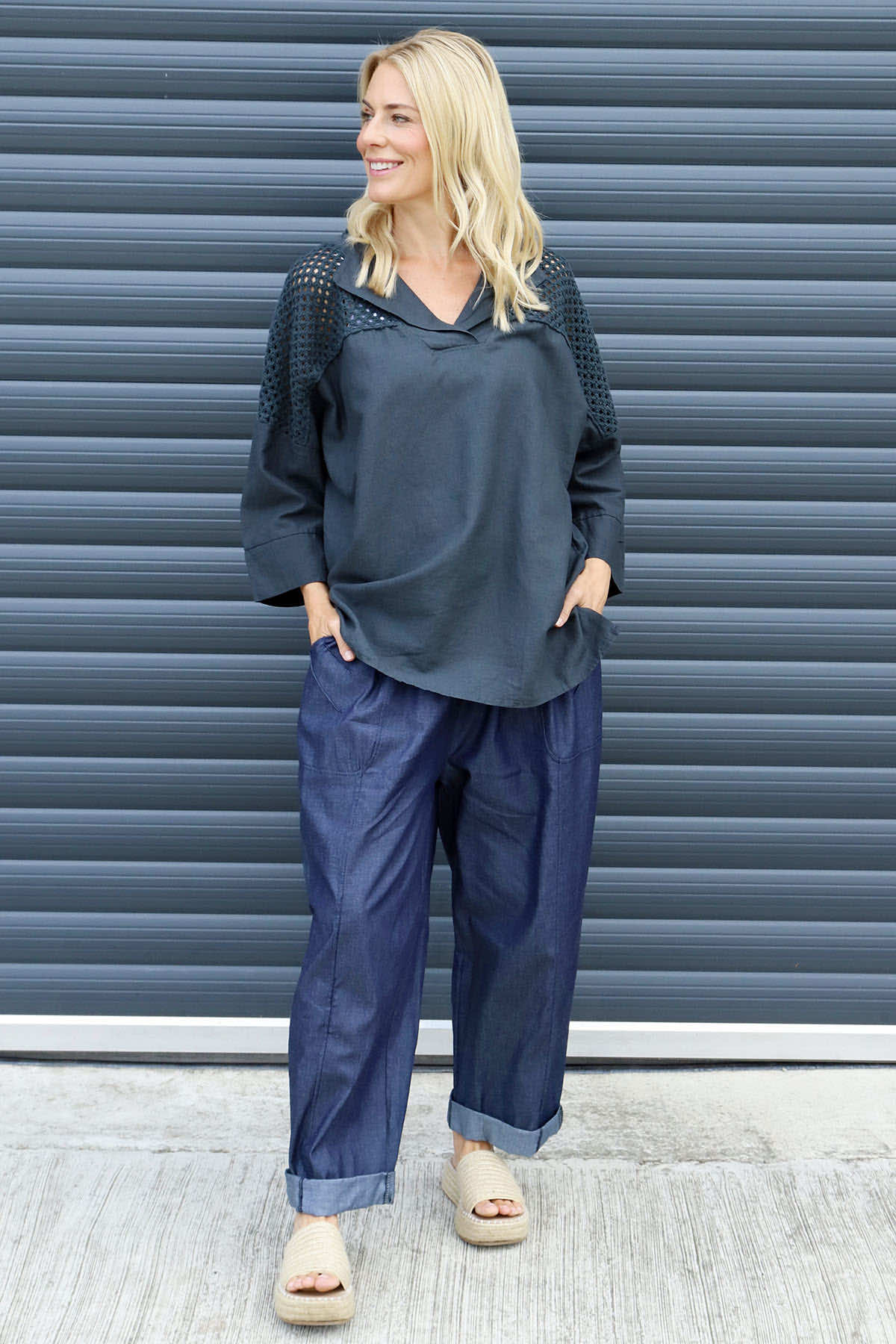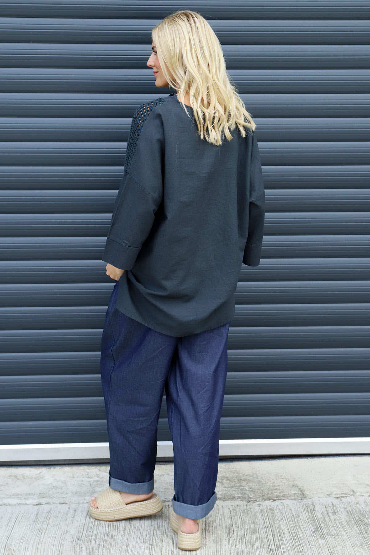 Natasha Crochet Shoulder Linen Top Charcoal Charcoal - Natasha Crochet Shoulder Linen Top Charcoal Charcoal