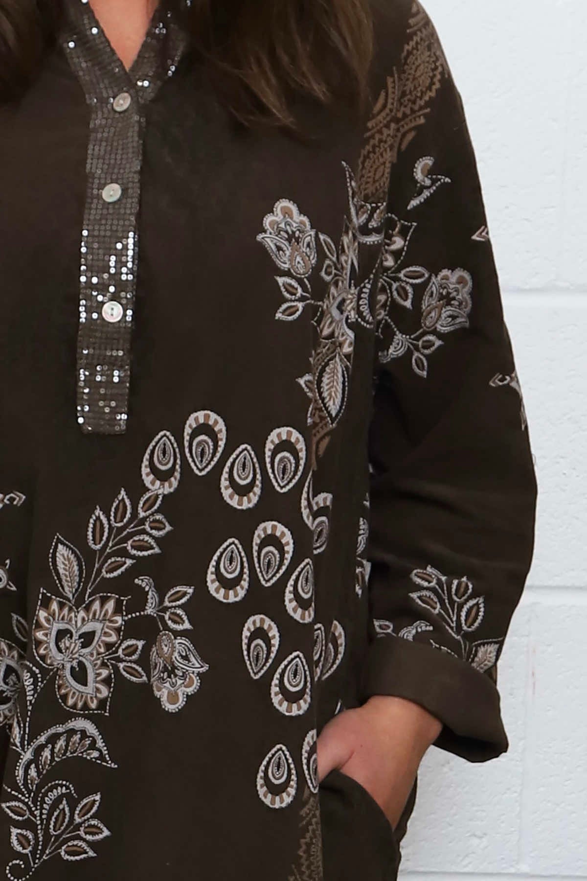 Introducing the Alana Needlecord Pattern Dress – a versatile piece that brings together comfort and style. This charming dress features a flattering V neckline and classic grandad collar, paired with a convenient button front for easy dressing. The all-over print adds visual interest, while decorative sequin trim elevates the look with a touch of sparkle. Practical pockets keep your essentials close, and long sleeves provide warmth and coverage. Crafted from soft needlecord fabric, this dress is perfect for creating effortless everyday outfits with personality and flair.