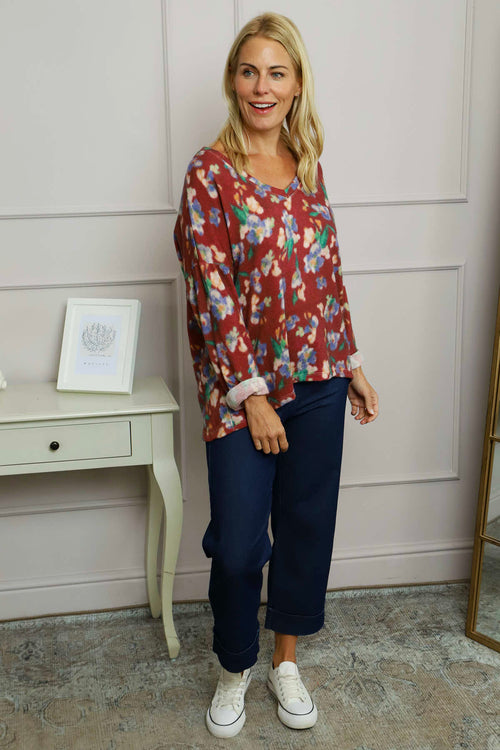 Kirsty Flower V-Neck Knit Top Wine