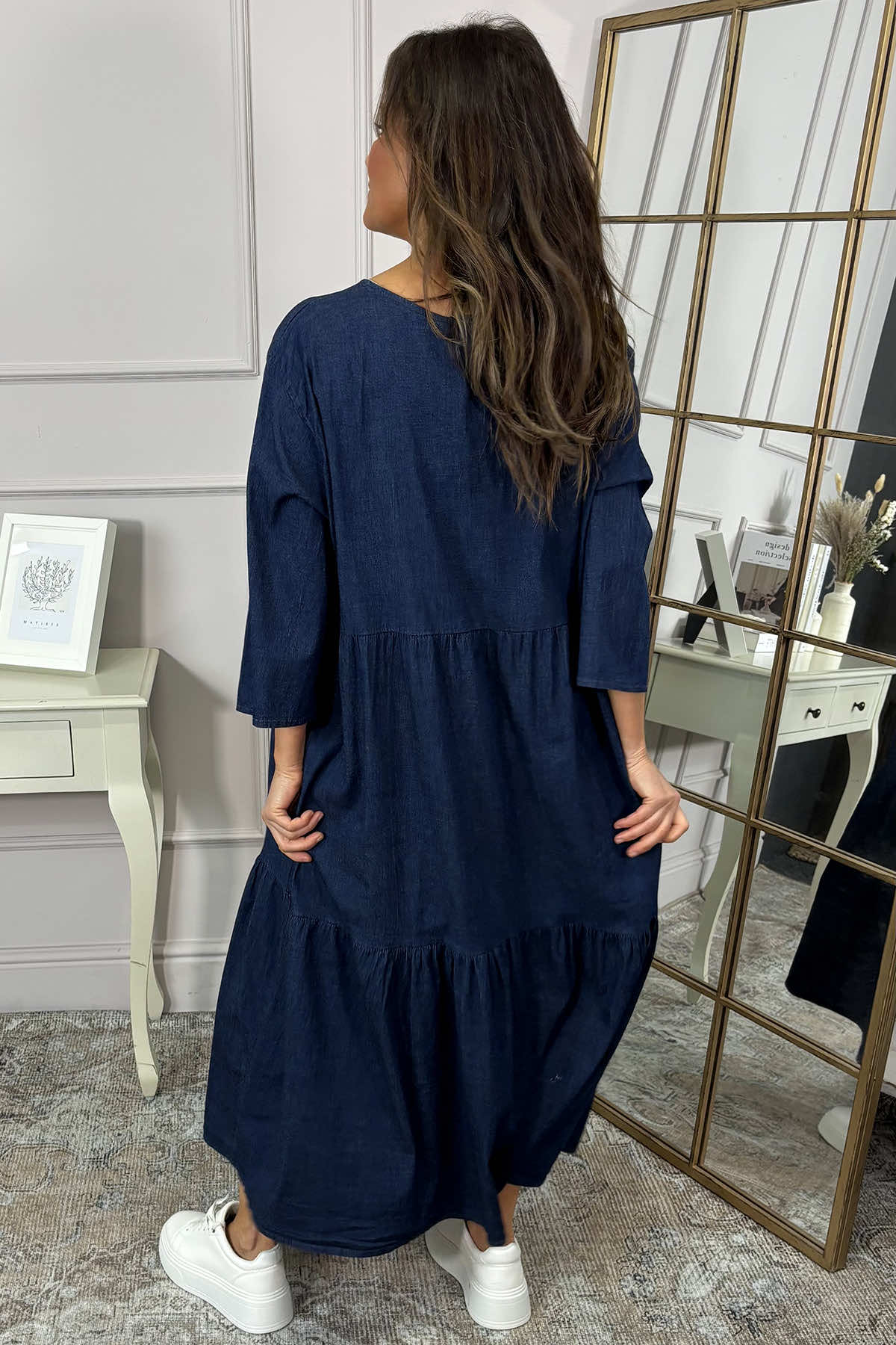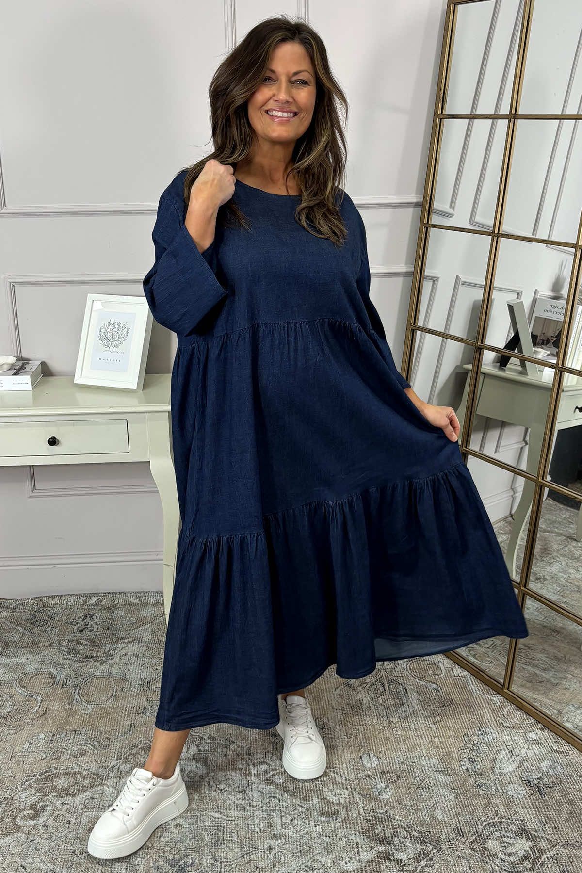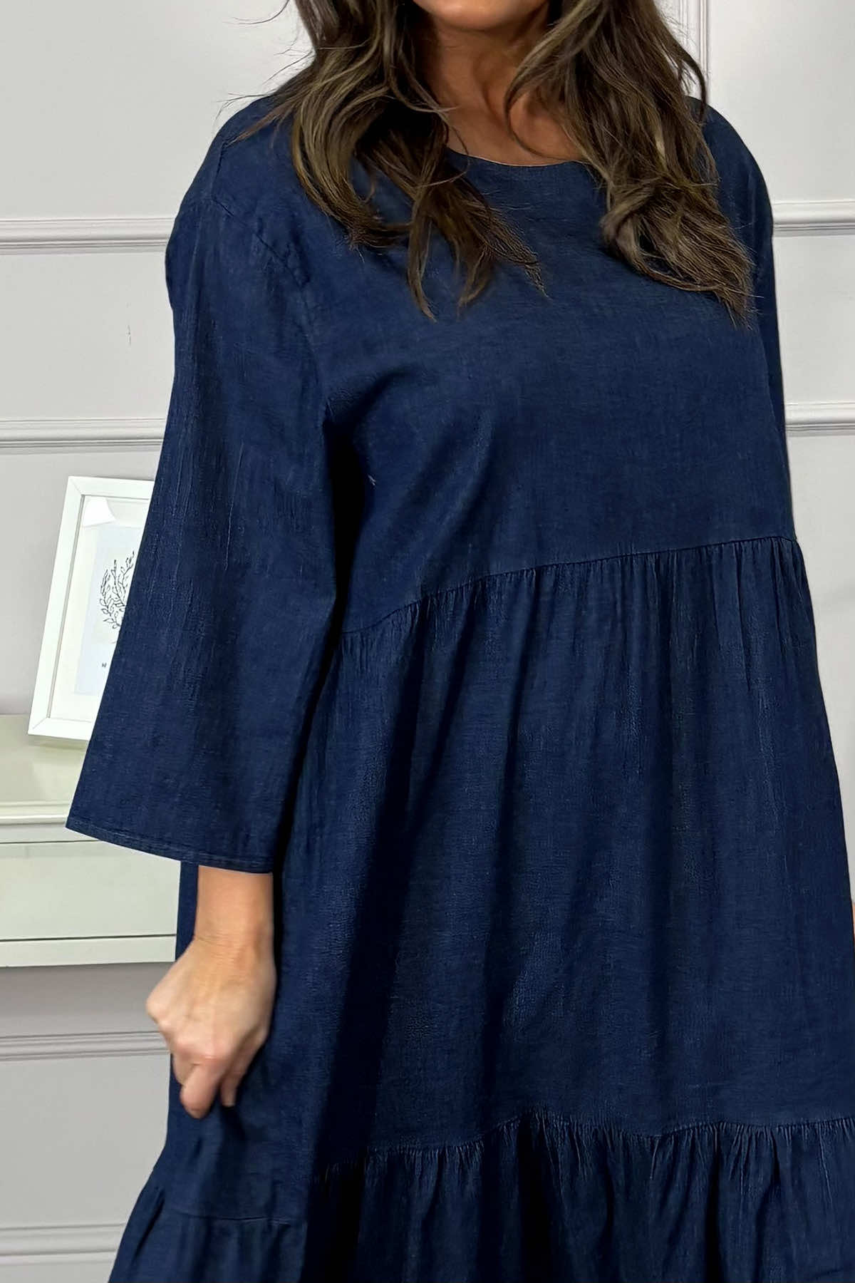 Introducing the Nova Denim Dress. This dress features a round neckline and a tiered design, crafted from a soft cotton fabric with elastane for the perfect fit. Stay comfortable and stylish all day long.