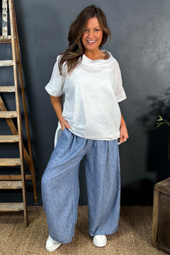 Baines Linen Top, a premium and exclusive design from Kit and Kaboodal. Crafted with a luxurious blend of linen and cotton, it boasts a flawless fit for all body types. It's short sleeves and stylish folded neckline add a touch of elegance to any outfit. Elevate your look with this must-have piece.