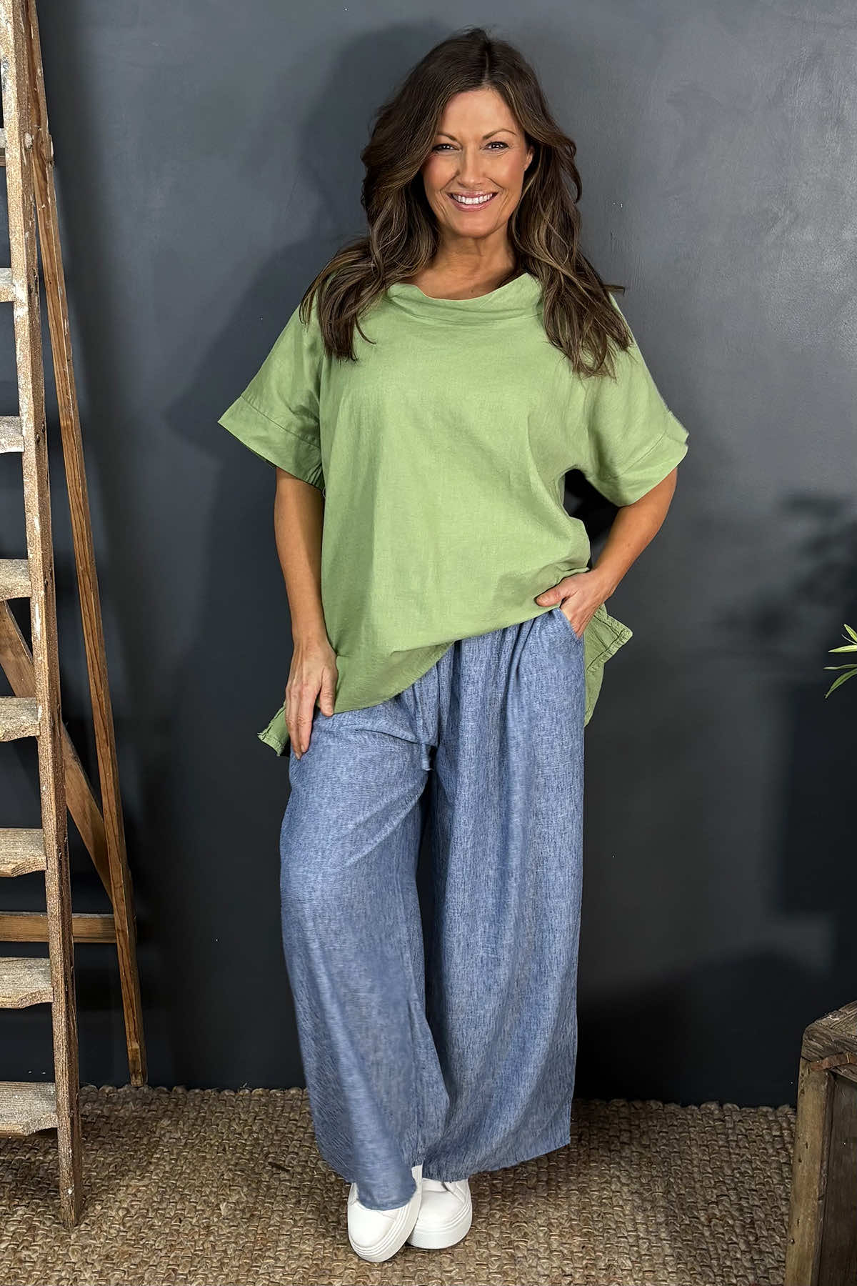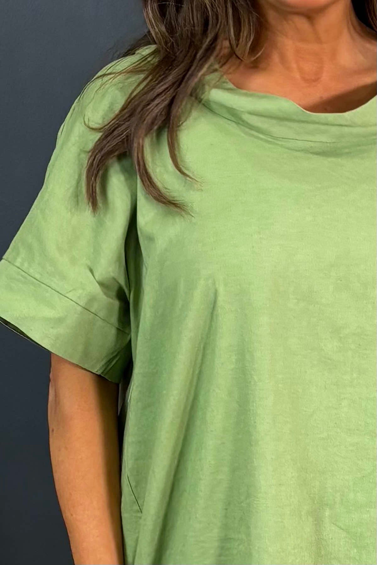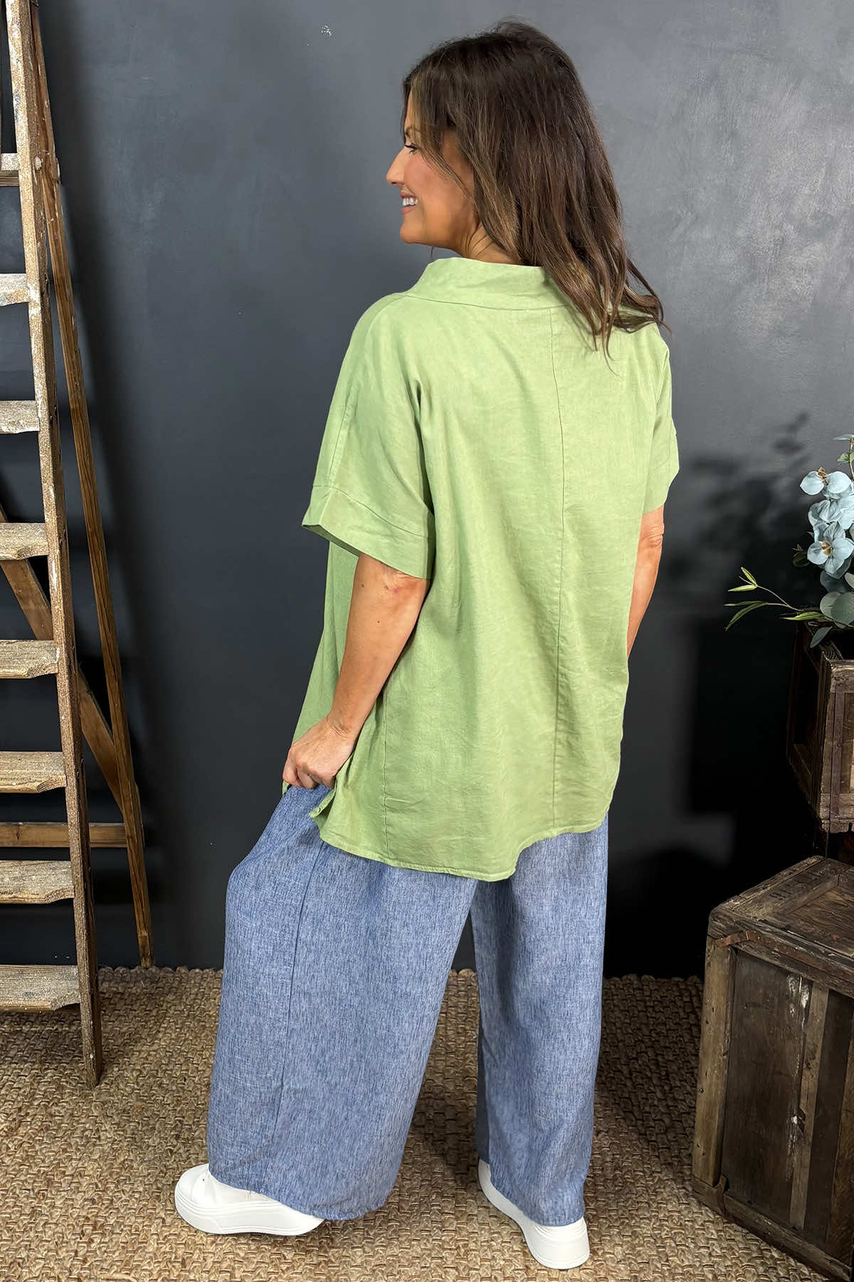 Baines Linen Top, a premium and exclusive design from Kit and Kaboodal. Crafted with a luxurious blend of linen and cotton, it boasts a flawless fit for all body types. It's short sleeves and stylish folded neckline add a touch of elegance to any outfit. Elevate your look with this must-have piece.