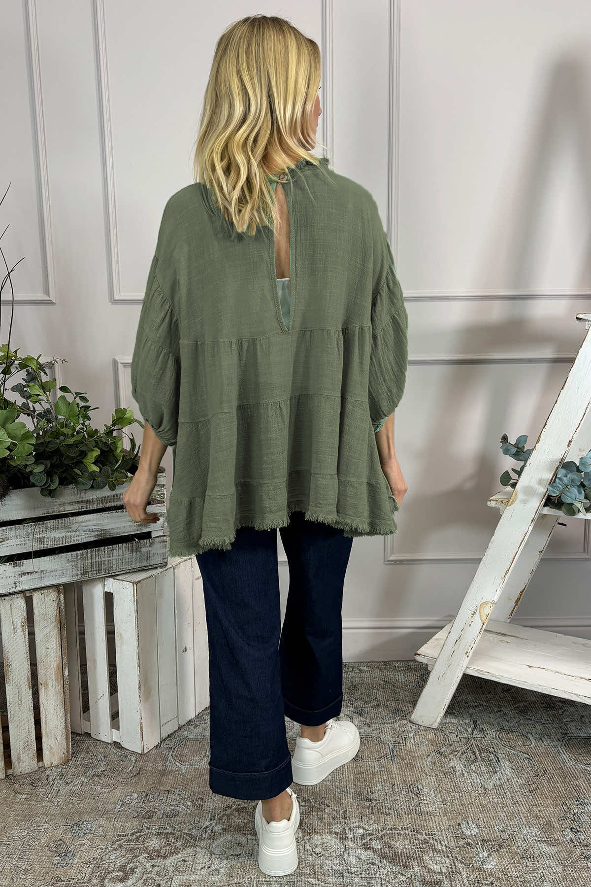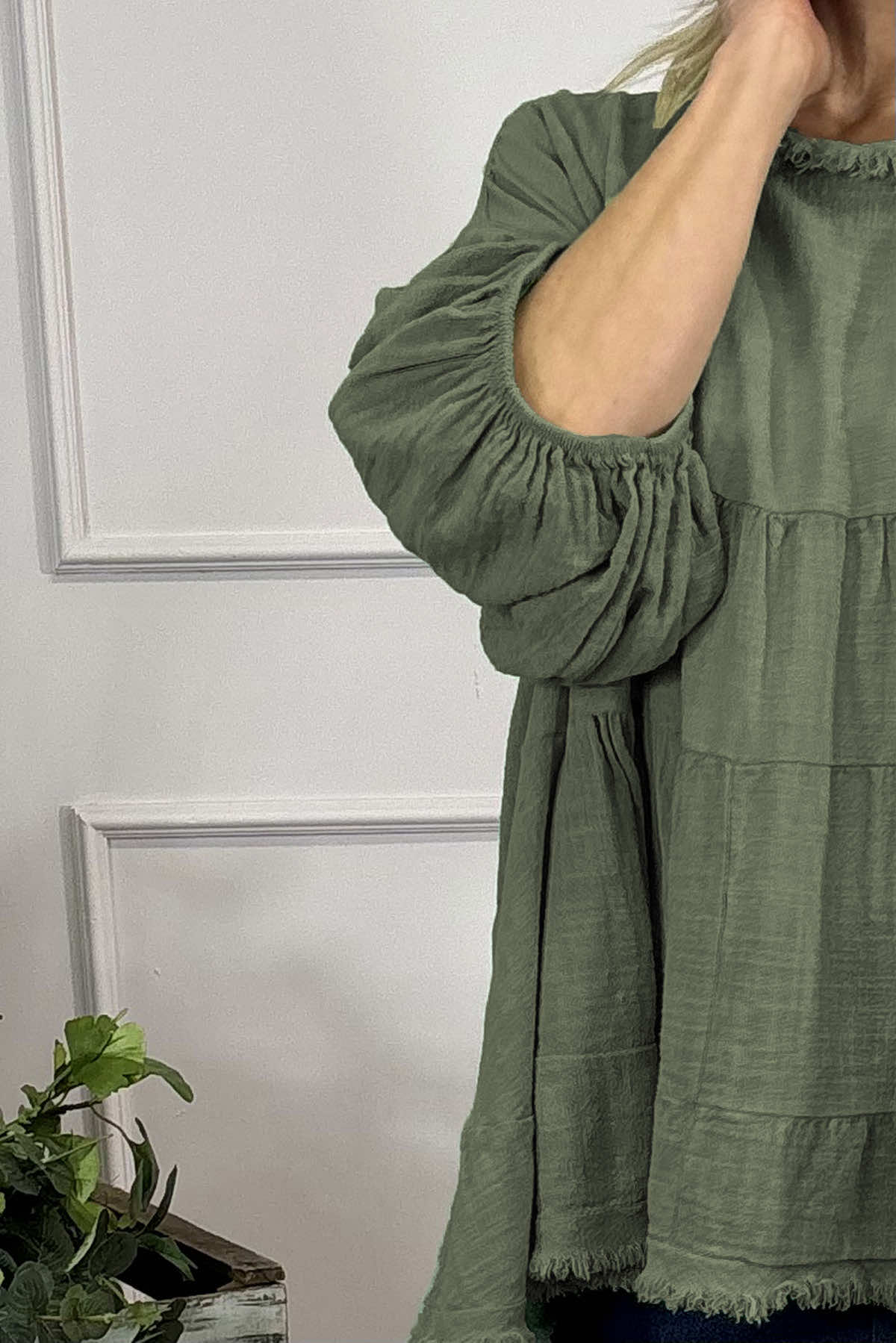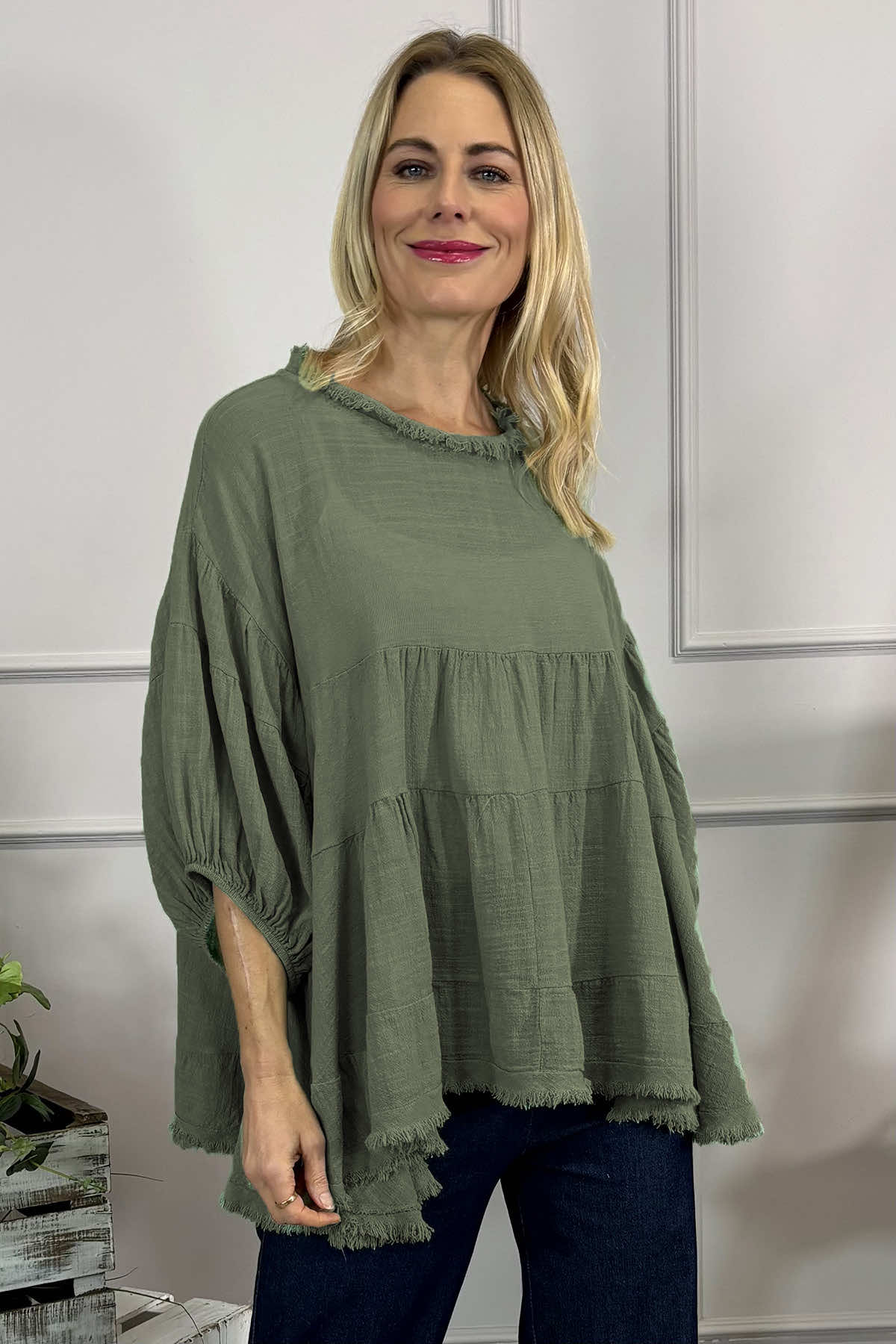 Dreamily soft and super stylish! The Made in Italy Bingham Tiered Top features frayed detailing around the neckline and hemline with statement puff sleeves. This gorgeous style can be paired with jeans. Crafted from 50% cotton 50% Linen.