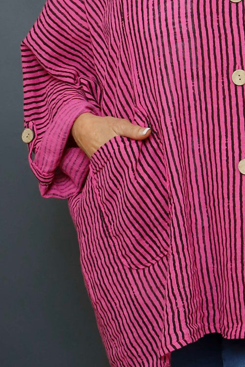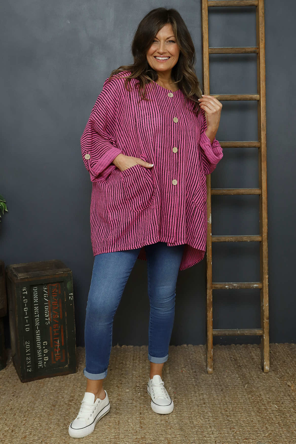 Stay cool and effortlessly chic with the Carlota Stripe Linen Jacket. Made from a luxurious linen and cotton blend, this jacket features stylish stripes, pockets with wooden buttons and a button back sleeve. A versatile and timeless addition to your wardrobe that will elevate any outfit.