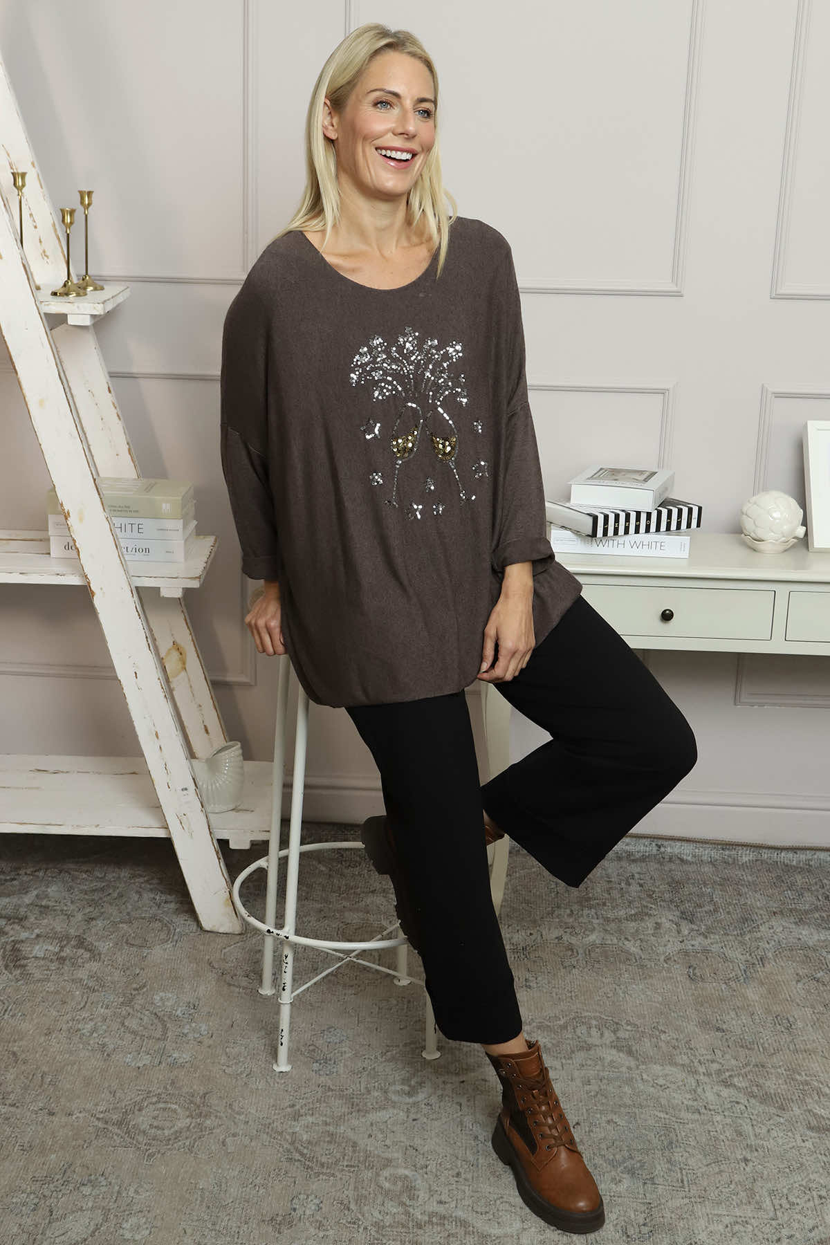 Get ready to sparkle with the Lillian Cheers Jumper. Featuring long sleeves and a comfortable round neckline, this jumper combines cosy wearability with festive style. The standout sequin champagne glass design adds a touch of celebration to your outfit, perfect for bringing warmth and cheer to any occasion.