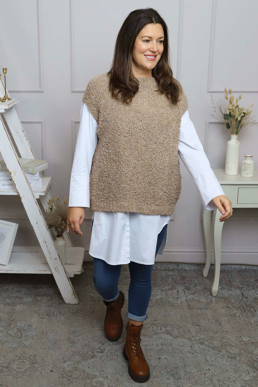 Layer up with the Clancy Boucle Tank Top, your new go-to piece for versatile warmth. Crafted from a luxuriously cosy knit with distinctive boucle texture, this tank brings depth and dimension to any outfit. The rounded neckline offers a flattering, timeless silhouette that works beautifully on its own or paired with your favourite cardigans and blazers. Embrace comfort without compromising on style.
