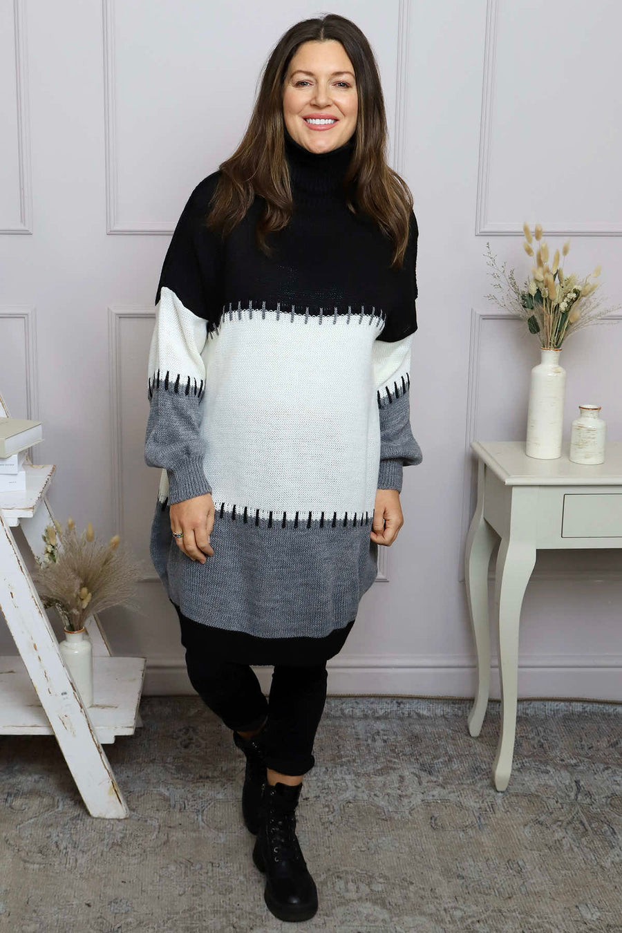 Discover the Doris Polo Knitted Jumper, a wardrobe essential that brings together comfort and understated sophistication. The snug polo neck keeps you warm whilst maintaining a refined appearance, and the extended length offers generous coverage for all-day wear. Eye-catching wide stripes inject personality into your outfit, whilst precision contrast stitching adds interest. This dependable knit transitions seamlessly from casual weekends to smart-casual occasions, giving you a piece you can confidently style in countless ways.