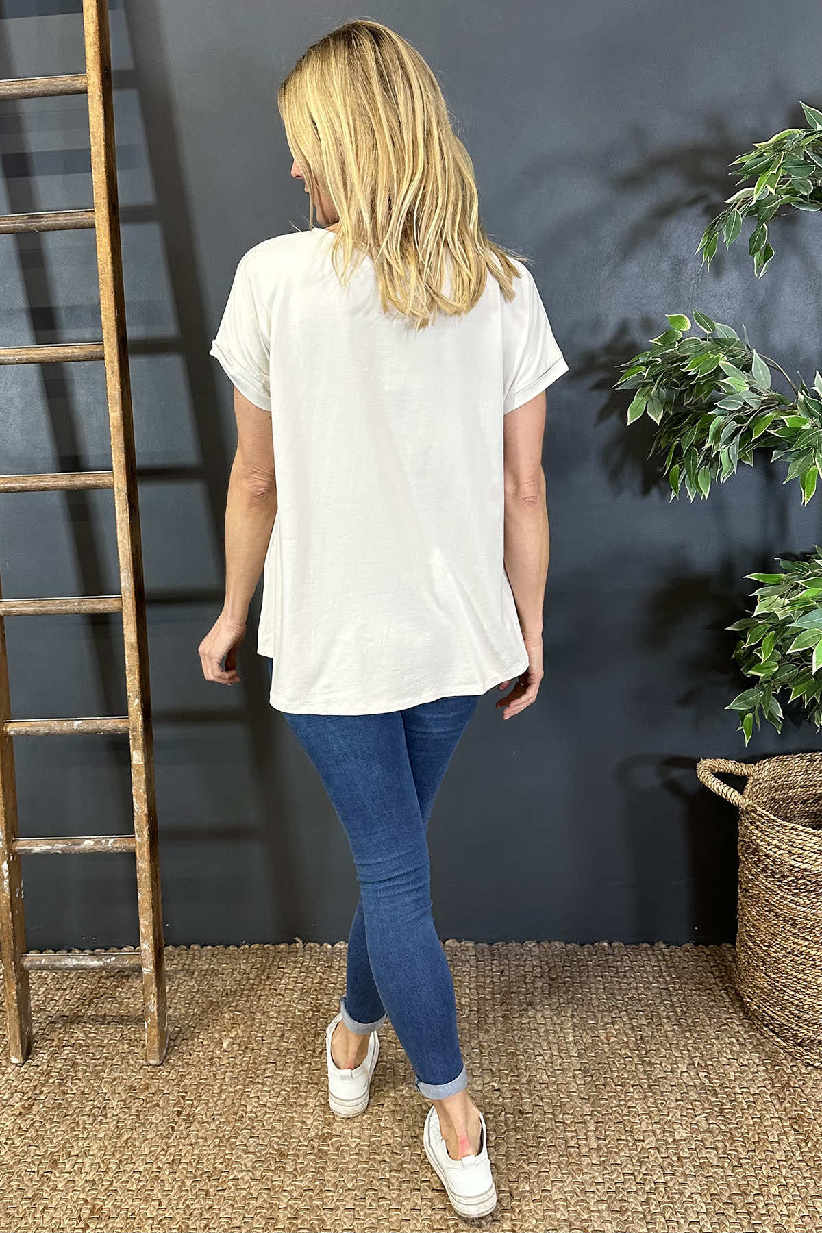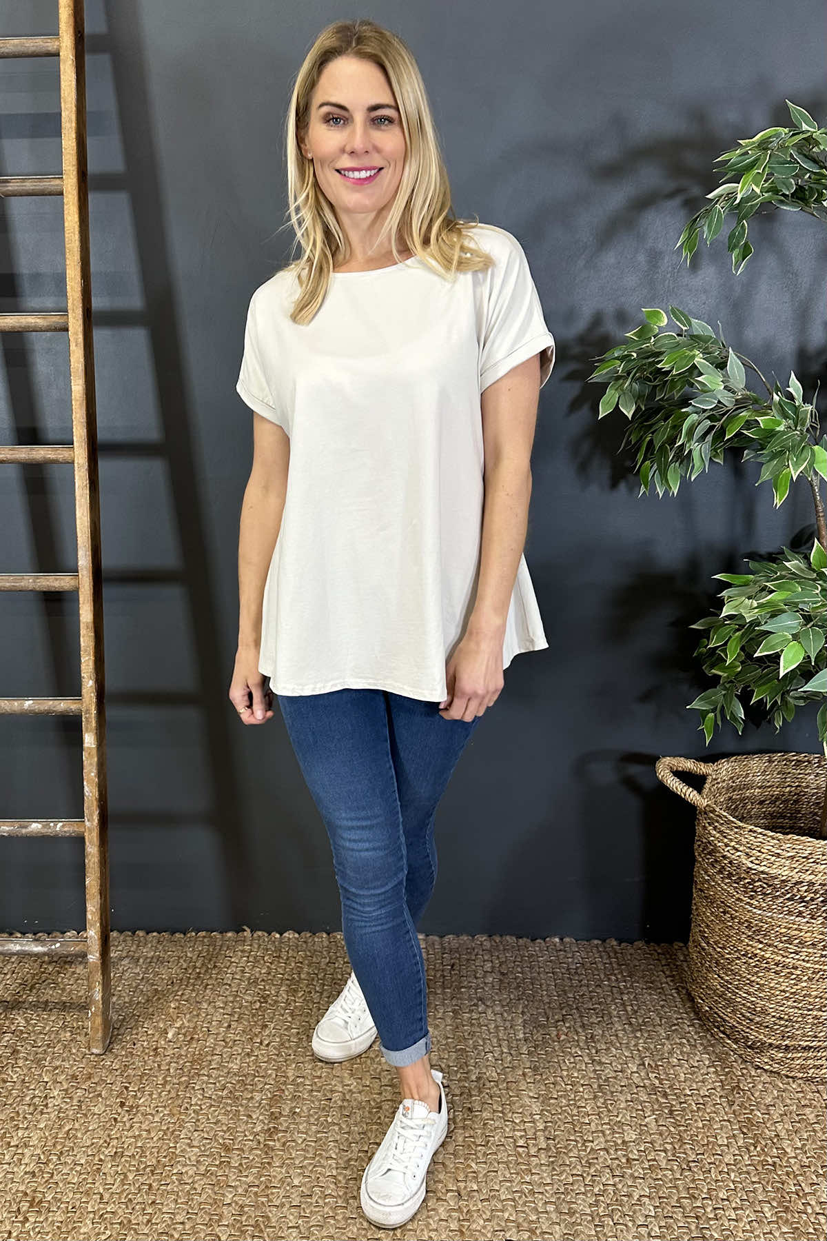 Introducing the Genevieve Cotton Tee, a classic essential for any wardrobe. Made from soft cotton, this tee can be worn on its own or paired with other pieces for a cosy layered look. With its turn back sleeves and round neckline, it's the perfect go-to for any occasion.