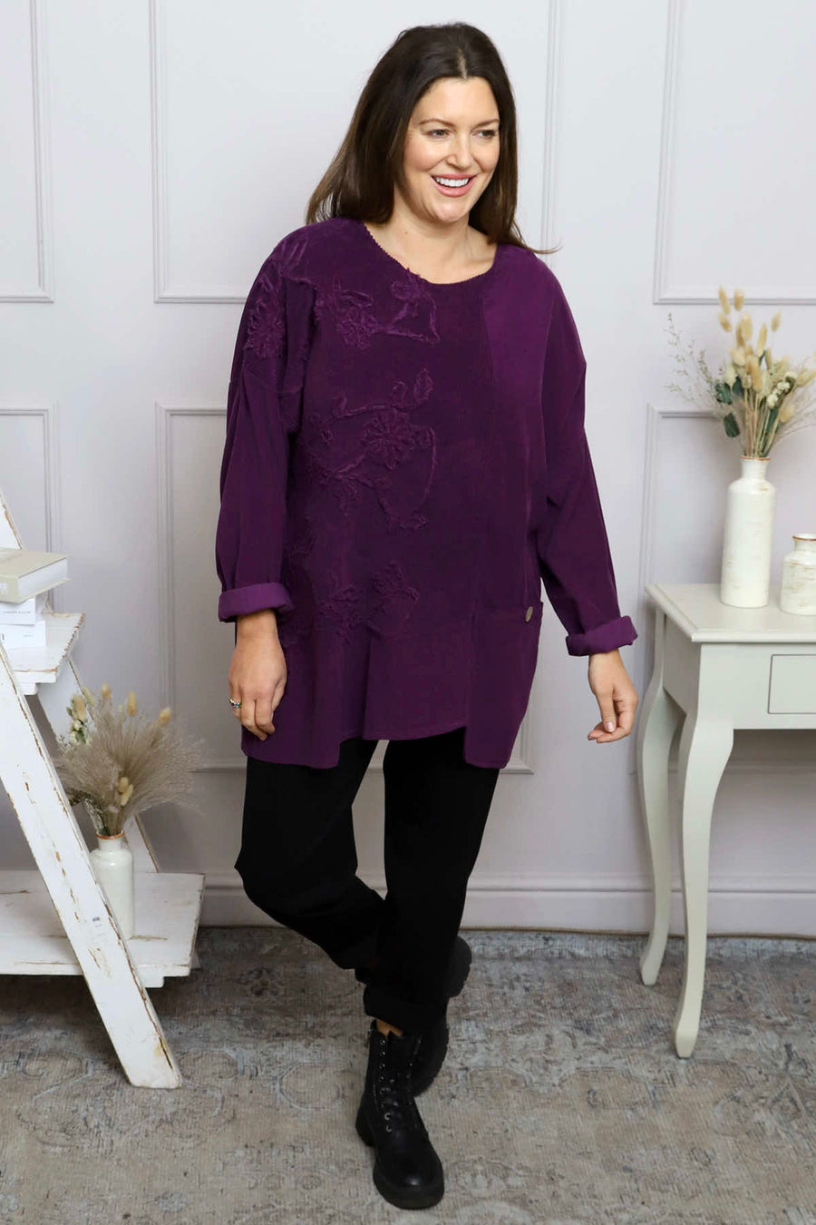 Refresh your wardrobe with the Jessa Needlecord Top, a versatile piece that effortlessly elevates your everyday style. Crafted from soft needlecord fabric, this top features long sleeves and a classic round neckline for timeless appeal. The textured patch detail adds visual interest, while a practical pocket keeps essentials within reach. An asymmetric hem creates a modern silhouette that flatters various body types. Perfect for layering or wearing solo, this top is designed to support your confidence and complement your personal style.