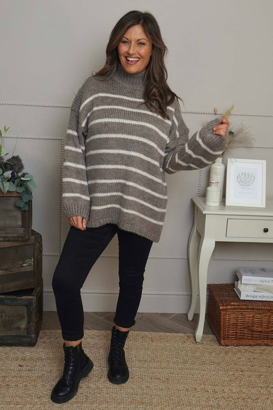 Stay warm and stylish with our Joella Stripe Knitted Jumper. The high neck and cosy knit provide warmth, while the horizontal stripes and shoulder seam detail add a touch of style. Perfect for any cold weather occasion.