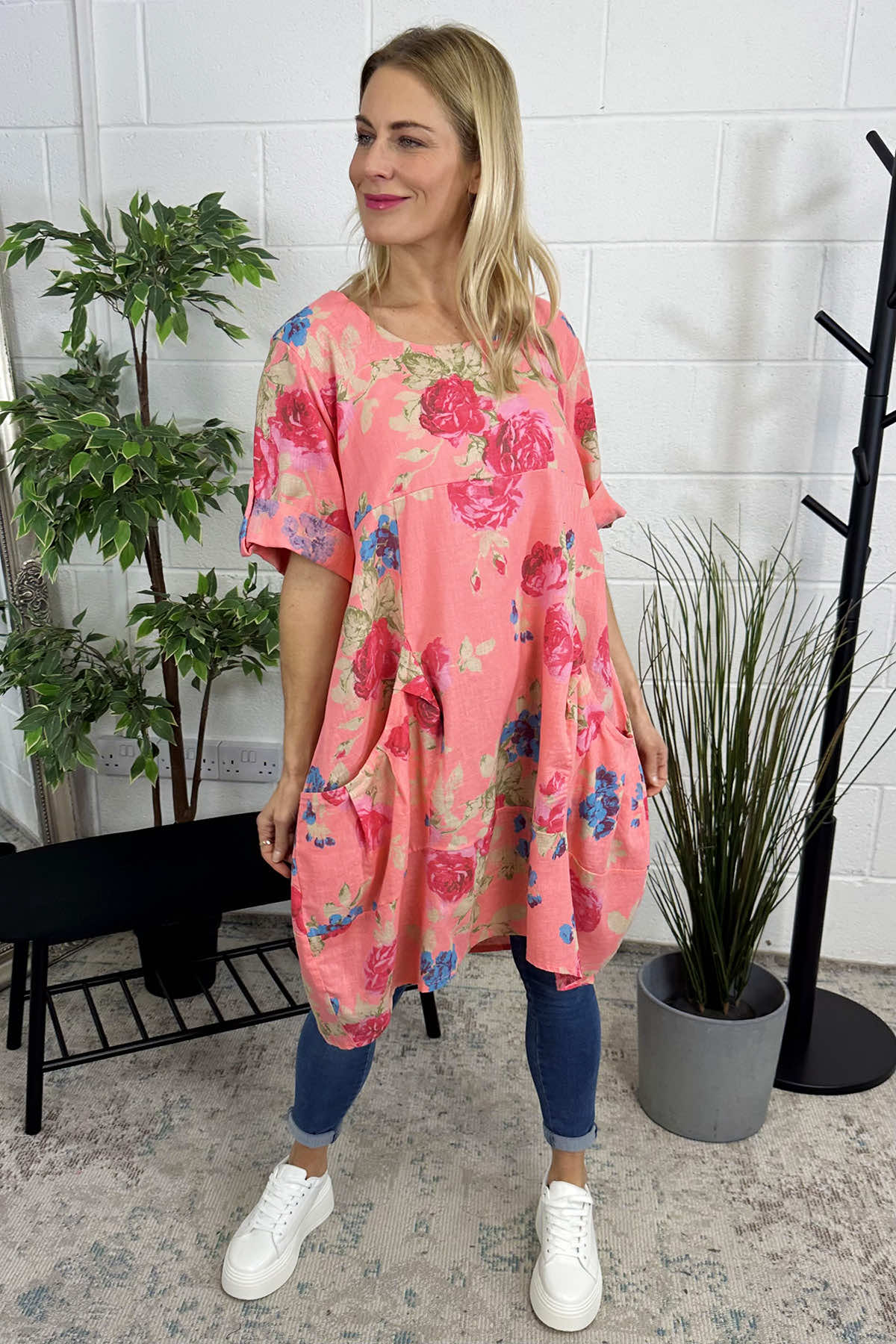 Transform your wardrobe with the Jolee Floral Print Linen Dress! Made with a mix of linen and cotton, this dress boasts a bold floral print and convenient pockets with pleat details. The button back sleeves and round neckline add a touch of elegance. Stand out in this must-have dress.