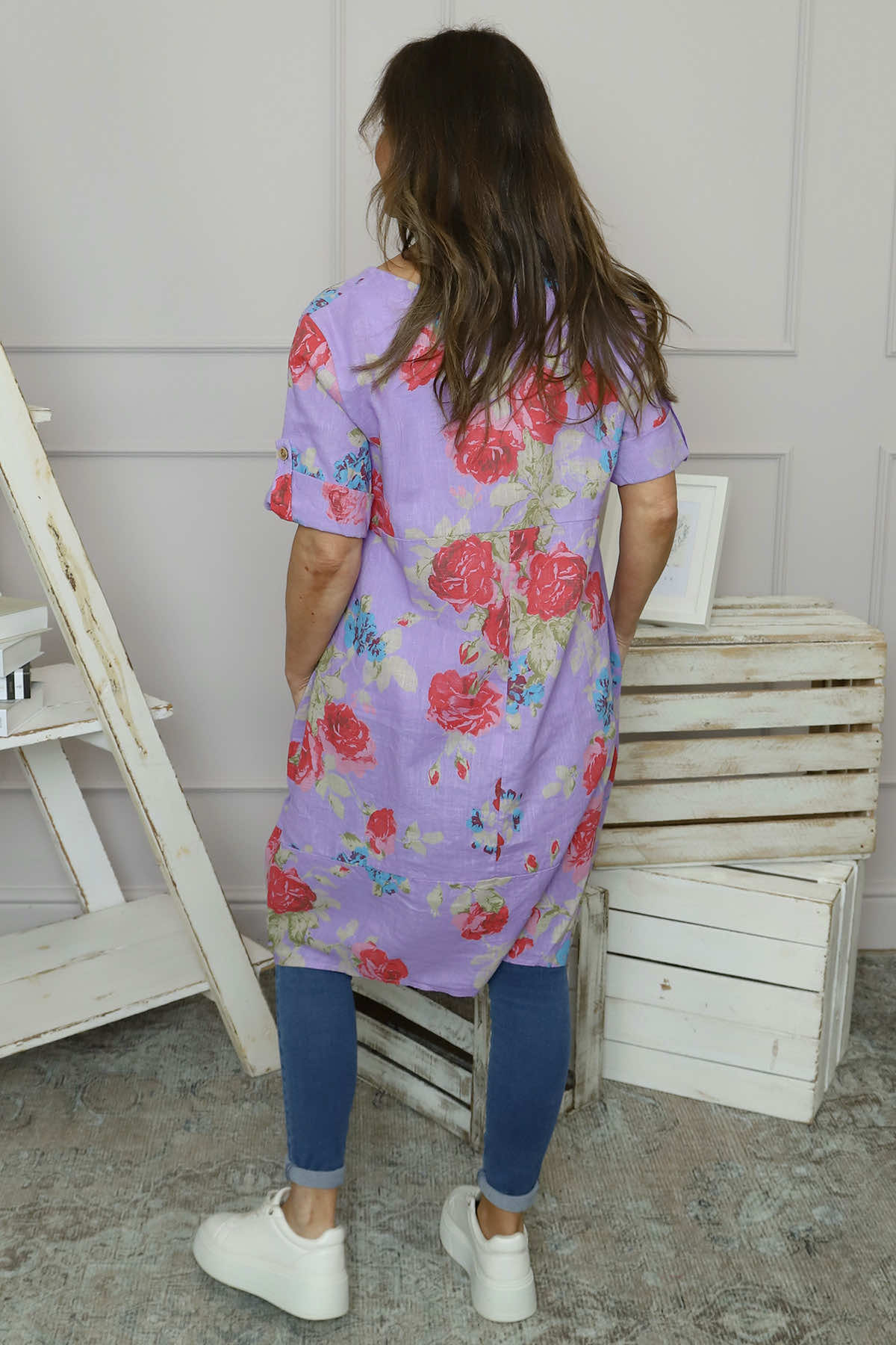 Transform your wardrobe with the Jolee Floral Print Linen Dress! Made with a mix of linen and cotton, this dress boasts a bold floral print and convenient pockets with pleat details. The button back sleeves and round neckline add a touch of elegance. Stand out in this must-have dress.