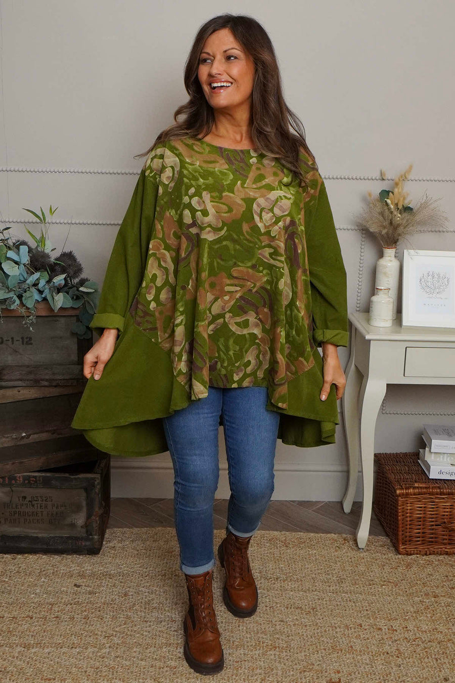 Kacey Print Needlecord Top Olive