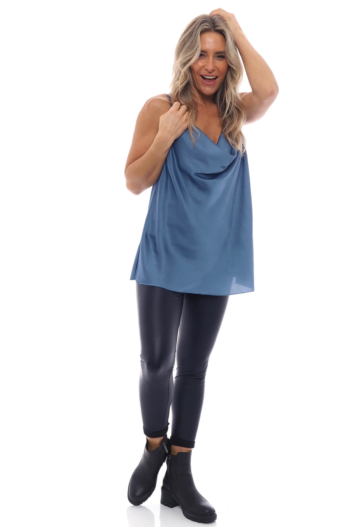 Dress up for your summer evenings with The Made in Italy Rinoa Vest Top. This classy style features a draped neckline with adjustable straps on a glossy satin fabric. Wear with jeans, trousers or a skirt depending on the occasion. Style with our Campbell Jacket. Kapri Fine Cord