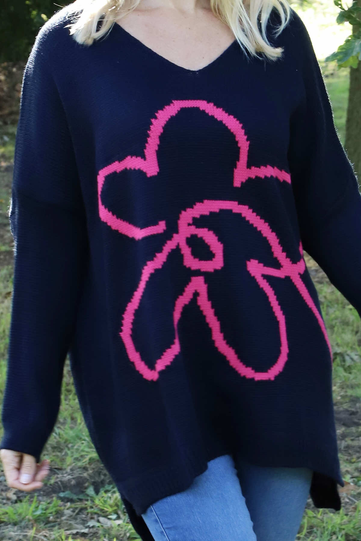 Elevate your look with the Roxanna Flower Knitted Jumper, designed to bring both comfort and style. Featuring a flattering V neckline and long sleeves, this cosy knit keeps you warm while enhancing your silhouette. The delicate sketched flower design adds a subtle artistic touch, making it a perfect choice for everyday wear that feels both comforting and chic.