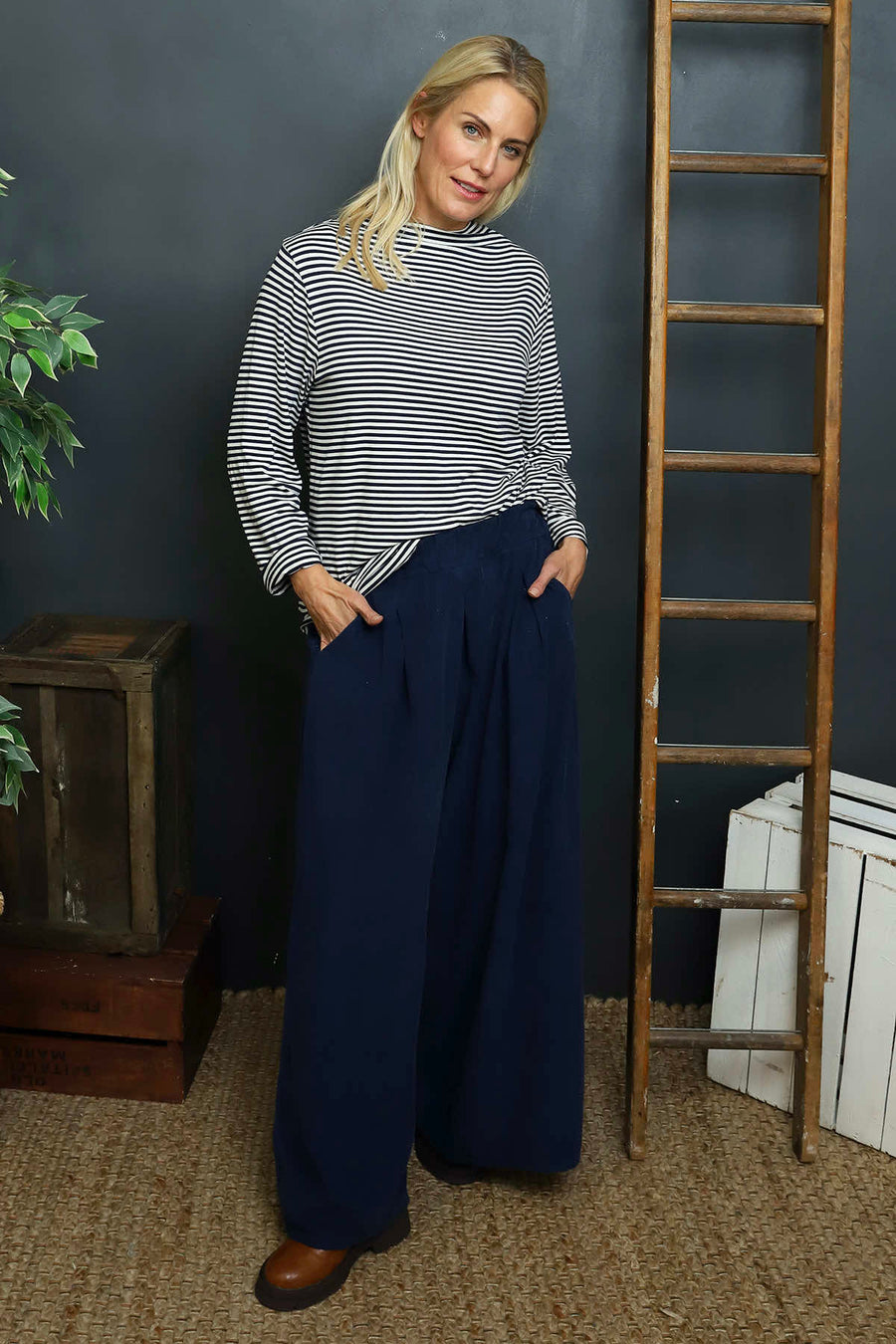 Step out in style with the Trish Wide Leg Needlecord Trousers. Featuring an elasticated waist for a comfortable fit and wide legs that move with you, these trousers combine ease with elegance. Crafted from soft needlecord fabric, they offer durability and a unique texture, while handy pockets add practicality. Perfect for everyday wear, they support your style and comfort effortlessly.